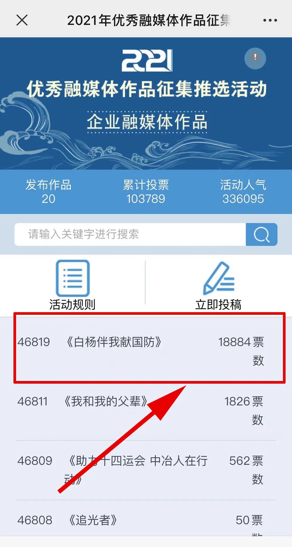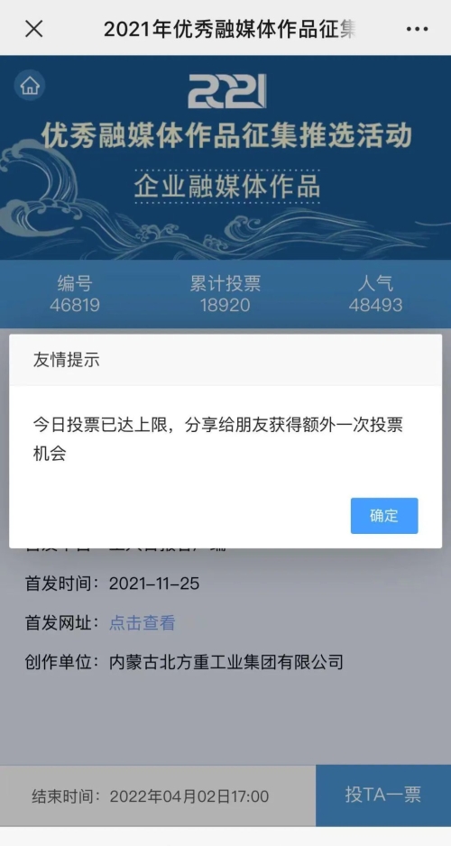 近日,由“文化強(qiáng)國(guó)”光明日?qǐng)?bào)協(xié)同推廣平臺(tái)、光明網(wǎng)、北京師范大學(xué)新媒體傳播研究中心和光明天翼5G融媒實(shí)驗(yàn)室共同主辦的“2021年優(yōu)秀融媒體作品征集推選活動(dòng)”開(kāi)啟線上投票環(huán)節(jié),經(jīng)過(guò)專(zhuān)家委員會(huì)評(píng)審,中國(guó)兵器工業(yè)集團(tuán)北重集團(tuán)《白楊伴我獻(xiàn)國(guó)防》音樂(lè)MV入選活動(dòng)前二十名,并進(jìn)入網(wǎng)絡(luò)投票環(huán)節(jié)。 《白楊伴我獻(xiàn)國(guó)防》 楊樹(shù)參天 高聳云端的是兵工人 “履行好強(qiáng)軍首責(zé)”的壯志凌云! 深植北疆 傾獻(xiàn)沃土的是北重人 “推動(dòng)高質(zhì)量發(fā)展”的壯志豪情! 白楊樹(shù)伴著我們茁壯成長(zhǎng) 見(jiàn)證著我們獻(xiàn)身國(guó)防! 投票方式 1.掃描下方二維碼,進(jìn)入初始界面,點(diǎn)擊“企業(yè)融媒體作品征集”,進(jìn)入投票界面點(diǎn)擊《白楊伴我獻(xiàn)國(guó)防》,點(diǎn)擊“投TA一票”; 2. 每人每日可投10票,直至提示投票達(dá)到上限即可; 3.投票時(shí)間:2022年3月17日09:00-2022年4月2日17:00。 來(lái)源/光明網(wǎng)、北重集團(tuán) |