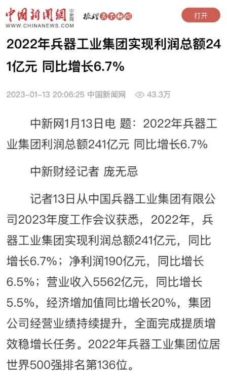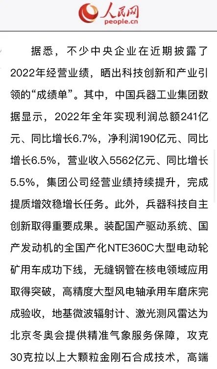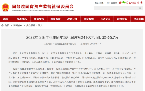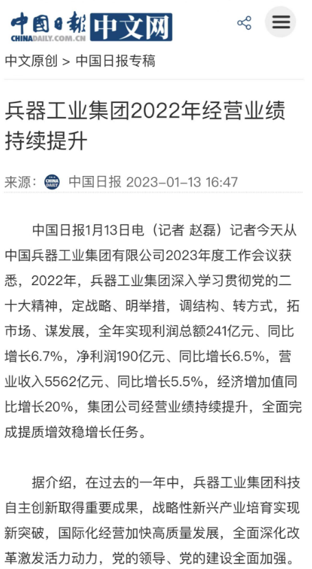 1月13日,中國兵器工業(yè)集團(tuán)有限公司召開2023年度工作會(huì)議,傳達(dá)學(xué)習(xí)中央領(lǐng)導(dǎo)同志、軍方首長和上級(jí)部門重要批示,總結(jié)集團(tuán)公司2022年工作,研究部署2023年主要工作任務(wù)。 集團(tuán)公司2022年重點(diǎn)工作取得的成績及下一步的改革發(fā)展受到社會(huì)媒體廣泛關(guān)注。新華社、新華財(cái)經(jīng)、人民網(wǎng)、經(jīng)濟(jì)日?qǐng)?bào)客戶端、光明日?qǐng)?bào)客戶端、中國日?qǐng)?bào)網(wǎng)、中國科技網(wǎng)、中國新聞網(wǎng)、央廣網(wǎng)、國資委網(wǎng)站、學(xué)習(xí)強(qiáng)國中央企業(yè)學(xué)習(xí)平臺(tái)、新浪網(wǎng)、騰訊網(wǎng)、搜狐網(wǎng)、網(wǎng)易網(wǎng)、今日頭條等中央主流媒體、國家部委網(wǎng)站及知名網(wǎng)絡(luò)媒體對(duì)集團(tuán)公司工作會(huì)議進(jìn)行了報(bào)道,重點(diǎn)關(guān)注集團(tuán)公司高質(zhì)量發(fā)展、科技創(chuàng)新、戰(zhàn)略性新興產(chǎn)業(yè)培育、深化改革、國際化經(jīng)營、履行央企社會(huì)責(zé)任等內(nèi)容。其中新華社以《北斗時(shí)空智能服務(wù)平臺(tái)累計(jì)服務(wù)終端數(shù)突破15億》為題,重點(diǎn)報(bào)道了集團(tuán)公司2022年在自主創(chuàng)新、戰(zhàn)略新興產(chǎn)業(yè)培育、專利申請(qǐng)等方面取得的成績;經(jīng)濟(jì)日?qǐng)?bào)客戶端、光明日?qǐng)?bào)客戶端、中國日?qǐng)?bào)網(wǎng)等以《兵器工業(yè)集團(tuán)2022年經(jīng)營業(yè)績持續(xù)提升》為題,重點(diǎn)報(bào)道了集團(tuán)公司在高質(zhì)量發(fā)展、全面完成提質(zhì)增效穩(wěn)增長方面取得的成績。集團(tuán)公司門戶網(wǎng)站、微信公眾號(hào)、微博等新媒體也對(duì)集團(tuán)公司工作會(huì)議進(jìn)行了及時(shí)報(bào)道,各成員單位紛紛對(duì)相關(guān)內(nèi)容進(jìn)行轉(zhuǎn)載,引發(fā)全系統(tǒng)關(guān)注。 新華社:北斗時(shí)空智能服務(wù)平臺(tái)累計(jì)服務(wù)終端數(shù)突破15億 新華財(cái)經(jīng):兵器工業(yè)集團(tuán)2022年實(shí)現(xiàn)凈利潤190億元 同比增長6.5% 人民網(wǎng):2022年中央企業(yè)營收同比增長8.3% 科技創(chuàng)新成效顯著 經(jīng)濟(jì)日?qǐng)?bào)客戶端:兵器工業(yè)集團(tuán)2022年經(jīng)營業(yè)績持續(xù)提升 光明日?qǐng)?bào)客戶端:兵器工業(yè)集團(tuán)2022年經(jīng)營業(yè)績持續(xù)提升 中國日?qǐng)?bào)網(wǎng):兵器工業(yè)集團(tuán)2022年經(jīng)營業(yè)績持續(xù)提升 中國科技網(wǎng):兵器工業(yè)集團(tuán)2022年實(shí)現(xiàn)利潤總額241億元 中國新聞網(wǎng):2022年兵器工業(yè)集團(tuán)實(shí)現(xiàn)利潤總額241億元 同比增長6.7% 國資委網(wǎng)站:2022年兵器工業(yè)集團(tuán)實(shí)現(xiàn)利潤總額241億元 同比增長6.7% 學(xué)習(xí)強(qiáng)國中央企業(yè)學(xué)習(xí)平臺(tái):兵器工業(yè)集團(tuán)2022年經(jīng)營業(yè)績持續(xù)提升 集團(tuán)公司職工及廣大網(wǎng)友熱議工作會(huì)議 “這次會(huì)議全面總結(jié)了2022年工作,深入分析研判當(dāng)前形勢(shì),部署2023年重點(diǎn)工作,為我們做好2023年及今后一個(gè)時(shí)期的工作明確了目標(biāo)、堅(jiān)定了信心。” “作為兵工人,我要苦練內(nèi)功、不懼挑戰(zhàn)、奮勇向前,為建設(shè)具有全球競爭力的世界一流集團(tuán)公司貢獻(xiàn)自己的力量?!?/p> “聚焦高科技領(lǐng)域,制造更多的大國重器,讓更多的產(chǎn)品服務(wù)老百姓?!?/p> “在不平凡的2022年取得了亮眼的工作成績,為兵器工業(yè)點(diǎn)贊。” “希望能有更多新型武器裝備部隊(duì),2023年,望你們?cè)賱?chuàng)輝煌,加油!” |