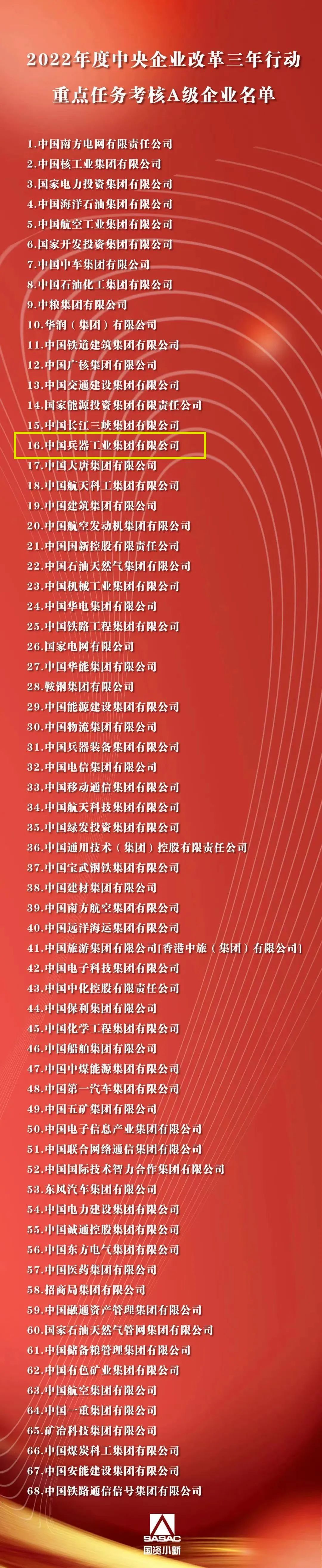 根據(jù)《中央企業(yè)改革三年行動重點任務(wù)考核實施方案(試行)》和《中央企業(yè)改革三年行動重點任務(wù)考核指標(biāo)表(2022版)》,經(jīng)審定,國務(wù)院國資委發(fā)布2022年度中央企業(yè)改革三年行動重點任務(wù)考核A級企業(yè)名單,中國兵器工業(yè)集團(tuán)有限公司獲評A級。 來源/國資委網(wǎng)站 |
