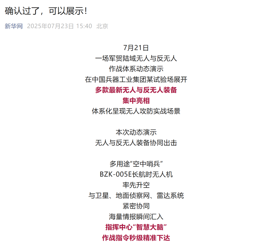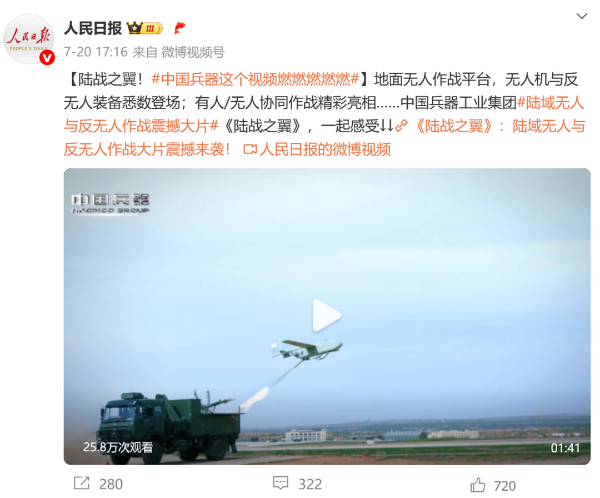 7月21日,中國兵器工業(yè)集團有限公司在位于內(nèi)蒙古的某試驗場舉辦軍貿(mào)陸域無人與反無人作戰(zhàn)體系主題日活動,攜無人機、巡飛彈、反無人機等最新武器裝備登場亮相,展現(xiàn)了一場無人與反無人領(lǐng)域激烈對抗的實戰(zhàn)場景。中央主流媒體、地方媒體、知名網(wǎng)絡(luò)媒體,以及集團公司各宣傳平臺紛紛進行報道,多次登上熱搜,引發(fā)廣泛關(guān)注。 央視新聞頻道《新聞直播間》《東方時空》《24小時》、國防軍事頻道《正午國防軍事》《軍事報道》《國防軍事早報》、中文國際頻道《今日環(huán)球》、央視軍事新媒體等報道了集團公司軍貿(mào)陸域無人與反無人作戰(zhàn)體系首次公開實裝動態(tài)演示有關(guān)情況,重點介紹了無人與反無人作戰(zhàn)最新裝備。 央視新聞頻道《新聞直播間》:內(nèi)蒙古 軍貿(mào)陸域無人與反無人作戰(zhàn)最新裝備亮相 央視新聞頻道《新聞直播間》:內(nèi)蒙古 軍貿(mào)陸域無人與反無人作戰(zhàn)最新裝備亮相 記者探訪無人裝備展區(qū) 央視新聞頻道《新聞直播間》:軍貿(mào)陸域無人與反無人作戰(zhàn)最新裝備亮相·記者探訪 最強“盾牌” 反無人機系統(tǒng)新升級 人民日報微博、央視軍事微博、央視新聞客戶端、中國新聞網(wǎng)、中新社國是直通車抖音、環(huán)球網(wǎng)微博、環(huán)球時報(X平臺、英文版客戶端)、中國日報網(wǎng)、央視軍事報道微博、中國軍號微博、中央廣播電視總臺“空天逐夢”微信視頻號、共青團中央B站、國資小新微博等中央主流媒體、國家部委的新媒體播發(fā)集團公司陸域無人與反無人作戰(zhàn)大片等視頻作品。 人民日報微博 央視軍事微博 人民日報、新華網(wǎng)、央視軍事、央視新聞、中央廣播電視總臺中國之聲、中國新聞網(wǎng)、中國日報網(wǎng)、中國日報英文報刊《CHINA DAILY》、《科技日報》、光明日報客戶端、環(huán)球網(wǎng)、環(huán)球時報、人民日報海外版-海外網(wǎng)、央視網(wǎng)、小央視頻、參考消息、瞭望東方周刊、共青團中央、國資小新新媒體、新浪網(wǎng)、騰訊網(wǎng)、搜狐網(wǎng)、鳳凰網(wǎng)、網(wǎng)易網(wǎng)等中央主流媒體、國家部委的新媒體及知名網(wǎng)絡(luò)媒體對集團公司軍貿(mào)陸域無人與反無人作戰(zhàn)體系主題日活動進行了圖文、音頻、視頻報道。 央視軍事微信 人民日報微信 新華網(wǎng)微信 來源/各主流媒體 |