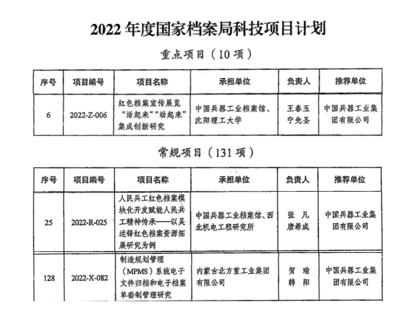 |   為深入貫徹落實《“十四五”全國檔案事業(yè)發(fā)展規(guī)劃》要求,著力提升檔案科研自主創(chuàng)新能力,根據《國家檔案局辦公室關于開展2022年度國家檔案局科技項目立項工作的通知》要求,中國兵器工業(yè)集團檔案館(以下簡稱檔案館)依據《2022年科技項目立項選題指南》,組織各單位申報成功三個檔案科技項目在國家檔案局立項,其中一個項目為國家級10項重點項目之一,排名第六,這是繼2021年在國家檔案局首次立項三個項目后的又一重大突破,標志著兵器工業(yè)檔案科研工作邁上新臺階。